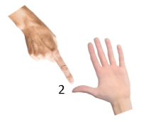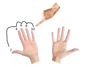 PASO 3. MANO IZQUIERDA. Preguntamos los números de la tabla del 2. ¿Cómo? Nos limitaremos a señalar de manera salteada todos los dedos, sin decir nada, esperando a que el niño diga el número que corresponde a cada dedo. Repetir hasta que no se equivoque.
