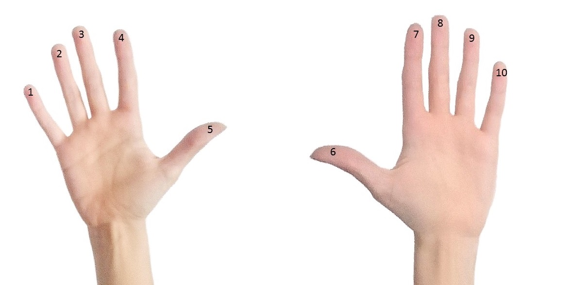 PASO 1. Asignar un número a cada dedo. Dile al niño que coloque las palmas de las manos hacia arriba, le explicamos que cada dedo tiene su lugar y cogiendo su dedo le decimos: este es el dedo 1, este es el dedo 2… como se ve en la imagen, pero sin escribir los números en las yemas de los dedos.